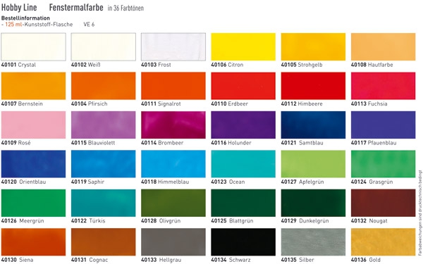 - 8 Farbtöne Window Color C2 je 125 ml (Kontur Schwarz, Weiß, Cognac, Apfelgrün, Citron, Pfirsich, Himbeere, Saphir)